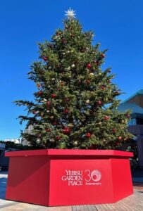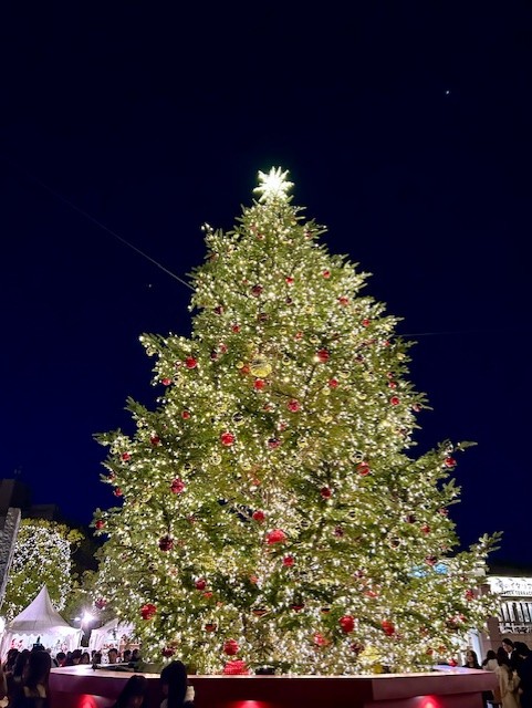 昼間は青空にグリーンとレッドが映えて、太陽の光の下クリスマスツリーが生き生きとしたオーラを放っています。